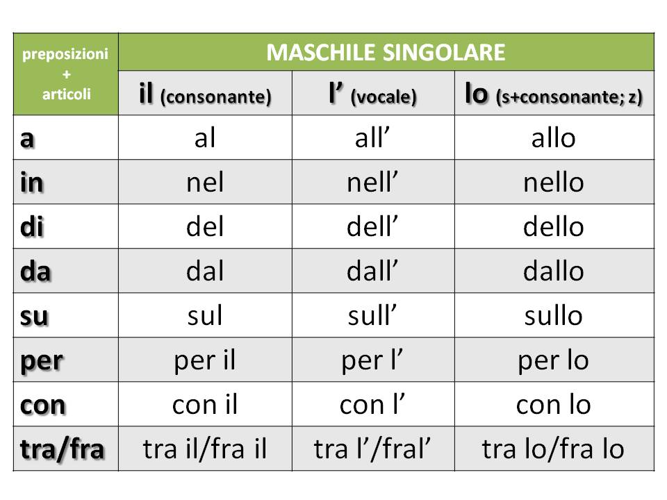 Le preposizioni semplici di, a, da, in e su formeranno quindi questa struttura grammaticale, che seguirà poi le stesse regole dell'articolo determinativo con cui viene formata.