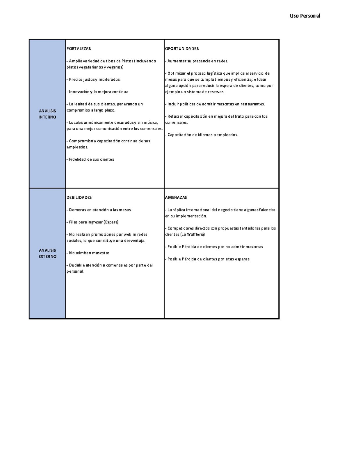 FODA C&W Actividad practica 1. Matriz FODA de Crepes & Waffles. Uso Personal ANALISIS