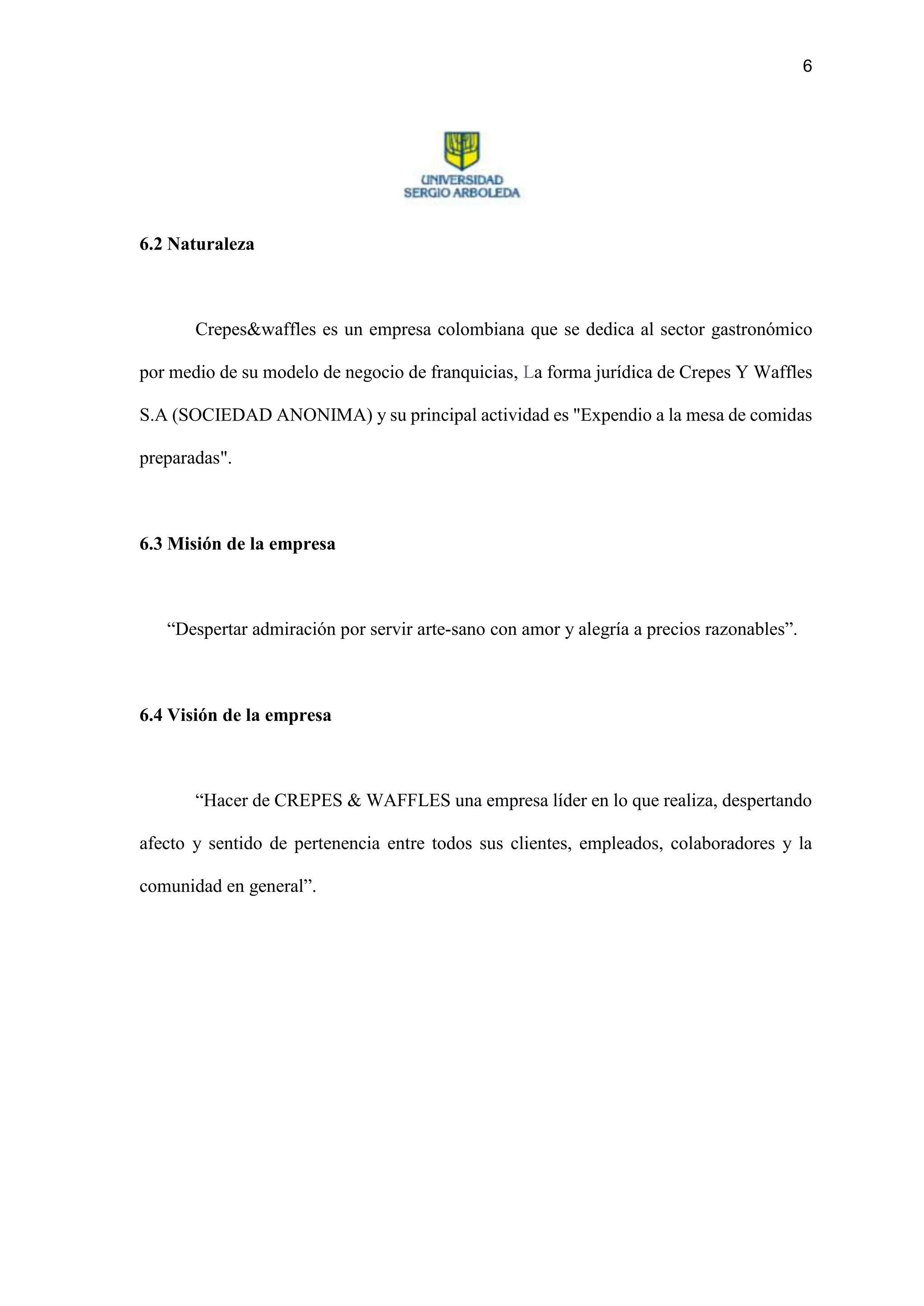 Crepes y Waffles busca ser un ejemplo de cómo la gastronomía puede fusionarse con la responsabilidad social, creando un modelo de negocio que va más allá de la rentabilidad financiera. Sección Específica: Visión. La visión de Crepes y Waffles refleja su deseo de trascender fronteras y ser reconocida a nivel mundial.